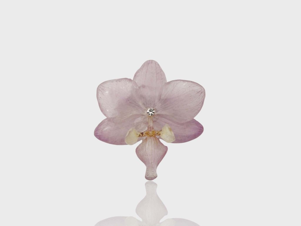 Květ orchideje byl odborně vysušen a pak pečlivě lístek po lístku na něj byla nanášena pryskyřice. Tím se docílilo zachování květu, který vypadá jako živý. Každý kousek je originál, protože příroda nevytváří dva naprosto stejné květy.