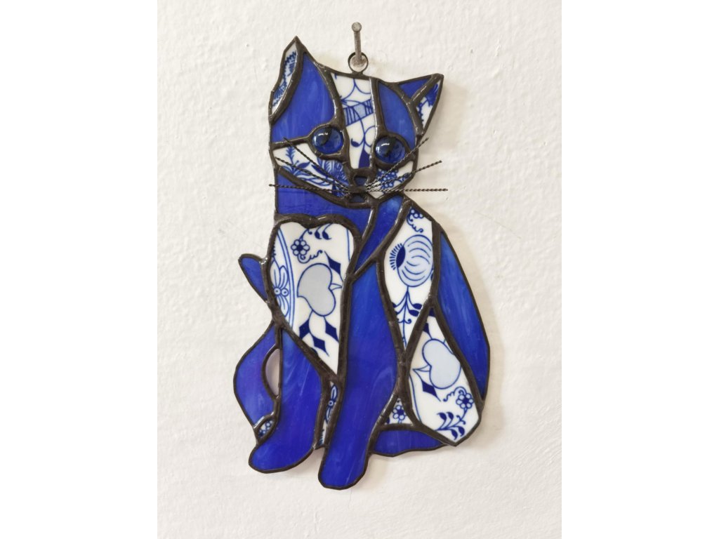 Zachyťte kouzlo naší vitráže tvořené tiffany technikou: půvabná sedící kočka z cibulákových střepů a modrého skla. Každý detail je s precizností ručně vytvořen, zvýrazňující jedinečnou kombinaci materiálů. Tato vitráž přináší do vašeho domova nejen umělecký zážitek, ale také příběh stojící za použitými střepy. Ideální dárek pro milovníky koček, cibuláku a originálních dekorací.